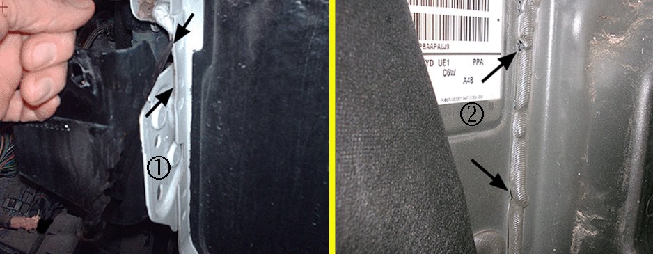 The water leak may be due to a lack of sealer (or voids in the sealer) at the seams of the front cowl area and front of dash (FOD), behind the left front fender. The above graphic shows two examples of seams missing sealer. (The position of seams 1 and 2, in relationship to each other, is shown clearer in the graphic below).