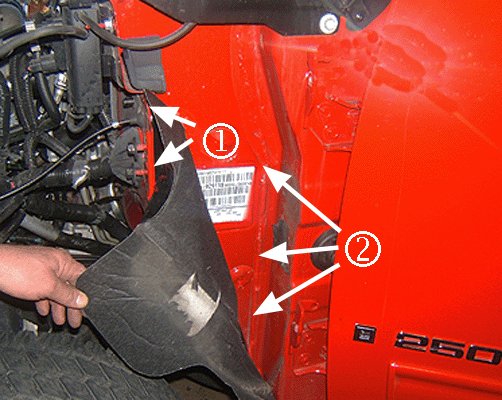 Remove the left front fender from the vehicle. Visually inspect and water test the cowl seams (1 and 2) noted in the above graphic, to verify the leak path. Seal the body seam by applying Kent Automotive High-Tech Clear Sealer (Part Number P10200 5 oz. tube), or equivalent, from outside the vehicle. Repeat water test to verify leak has been corrected, then reinstall the left fender.