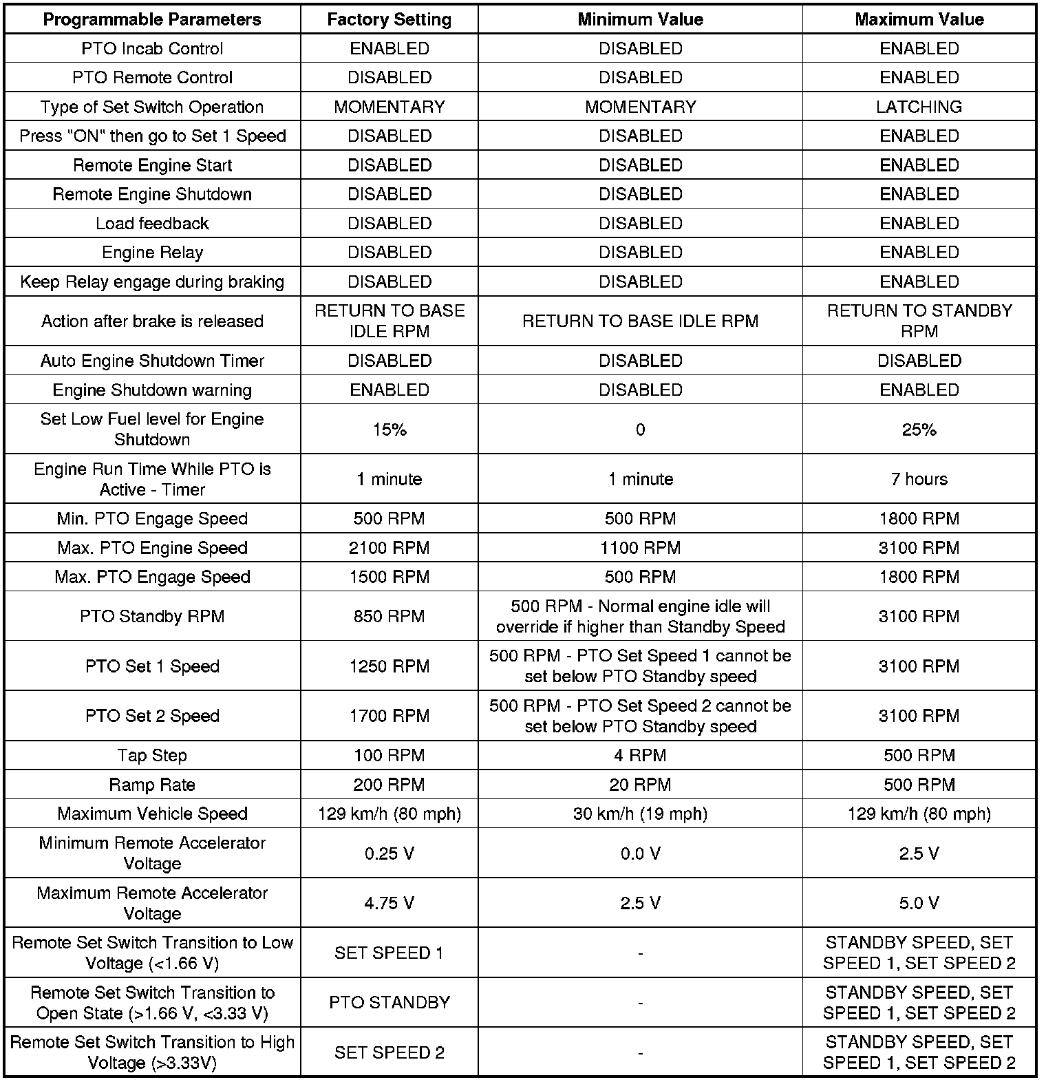 Preset PTO can only be used when the vehicle is not moving. The engine speed is initially set to a standby engine speed of 800 RPM. This provides an initial start-up engine speed to match the engagement of the PTO load. The PTO standby engine speed can be reprogrammed to higher speeds.