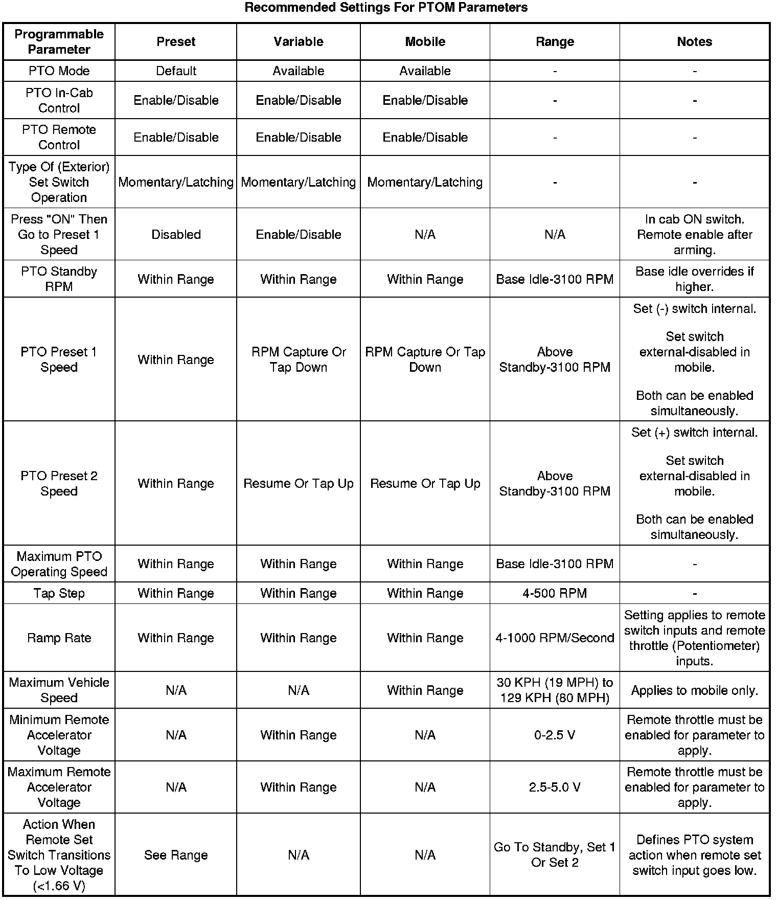Note: When programming the PTO control module be sure to verify the ECM PTO options (stationary, variable or mobile) are synchronized with the PTOM. Example, if the PTOM is set to stationary mode then the ECM must also be set to stationary mode. If the two modules are not synchronized no PTO idle up will occur. The critical parameters are listed below:
