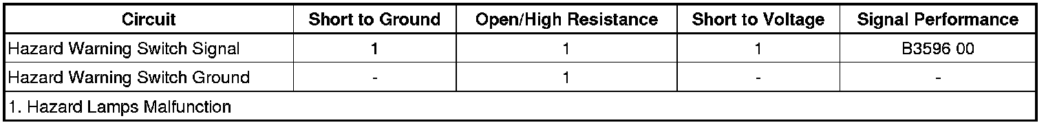 The hazard flashers may be activated in any power mode. The hazard warning switch signal circuit is momentarily grounded when the hazard warning switch is pressed. The body control module (BCM) responds to the hazard warning switch signal input by supplying battery voltage to all four turn signal lamps in an ON and OFF duty cycle. When the hazard warning switch is activated, the BCM sends a serial data message to the instrument cluster requesting both turn signal indicators to be cycled ON and OFF.