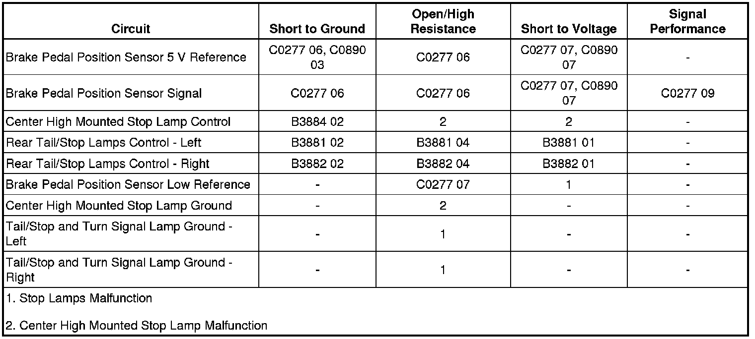 The brake pedal position (BPP) sensor is used to sense the action of the driver application of the brake pedal. The BPP sensor provides an analog voltage signal that will increase as the brake pedal is applied. The body control module (BCM) provides a low reference signal and a 5-volt reference voltage to the BPP sensor. When the variable signal reaches a voltage threshold indicating the brakes have been applied, the BCM will apply battery voltage to the left and right stop lamp control circuits as well as the center high mounted stop lamp (CHMSL) control circuit illuminating the left and right stop lamps and the CHMSL.