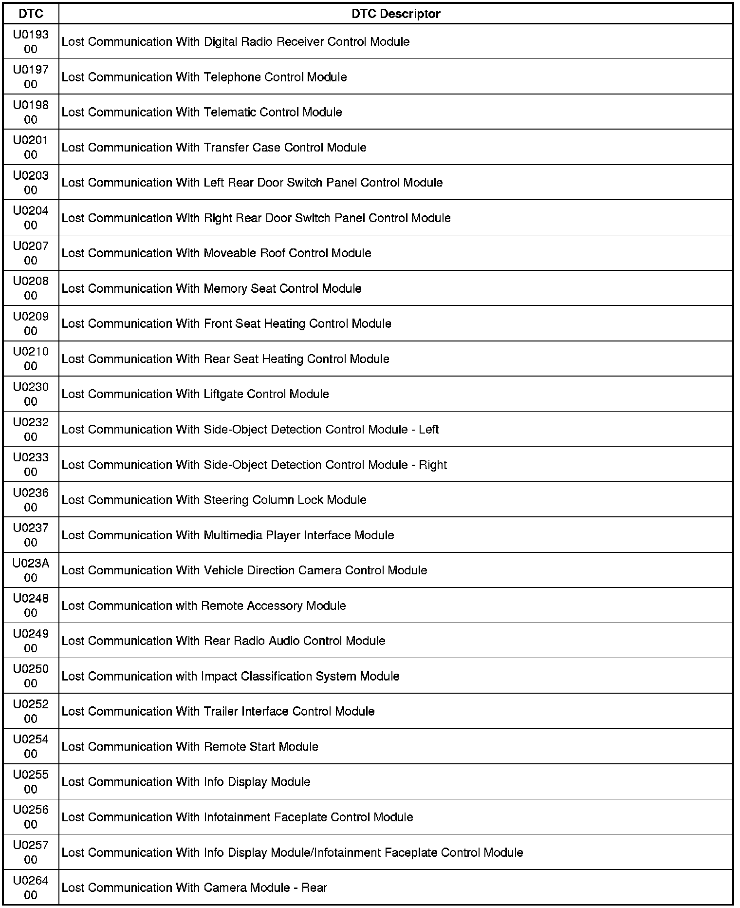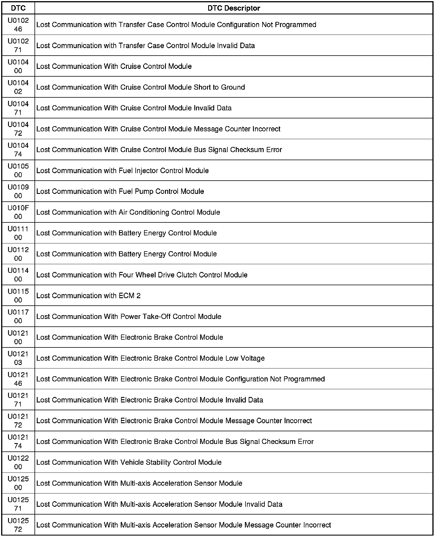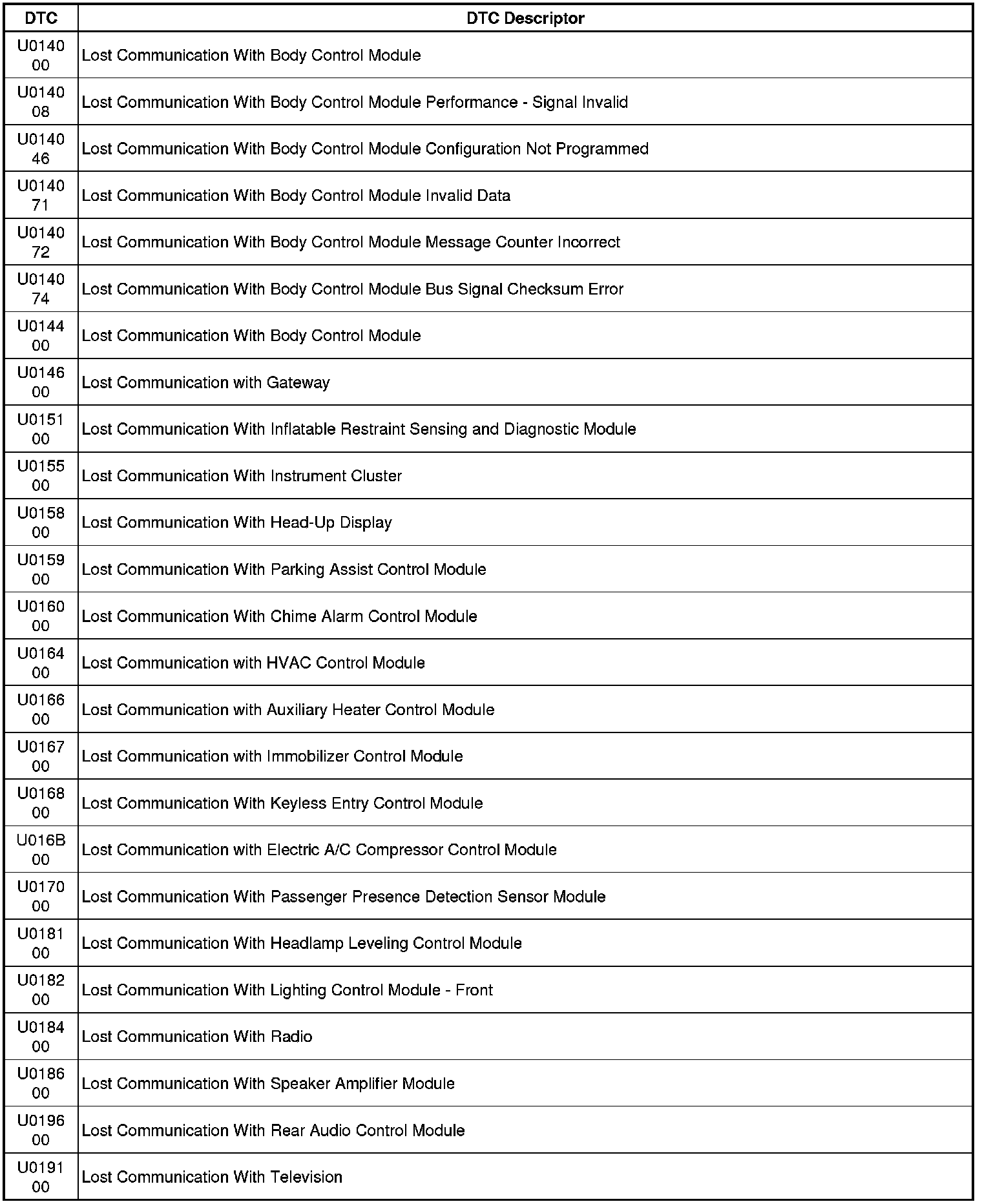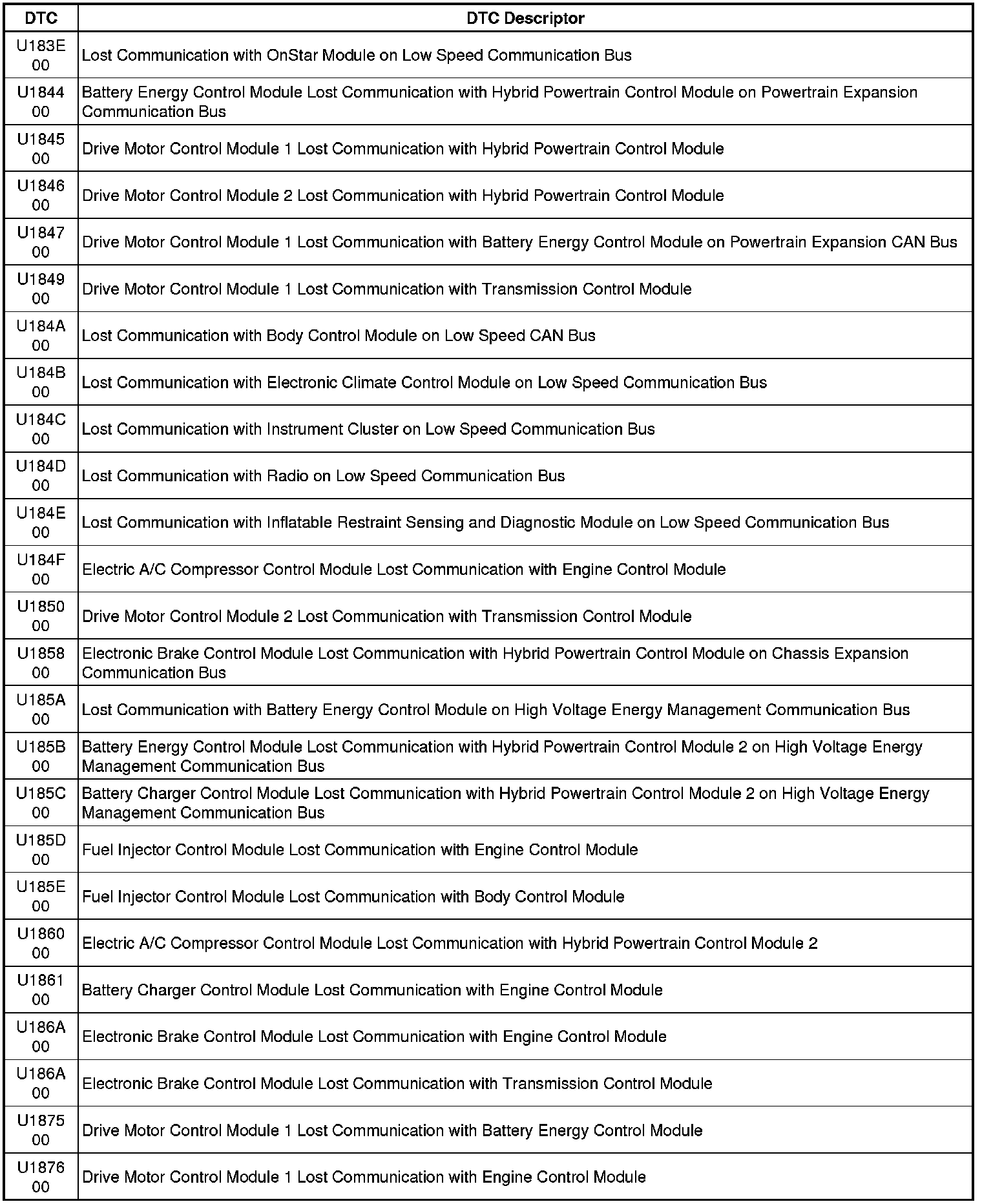 This list includes all Data Communications related U-code DTCs in alphanumeric order with descriptors for all modules. Not all DTCs listed will be applicable to all vehicles.