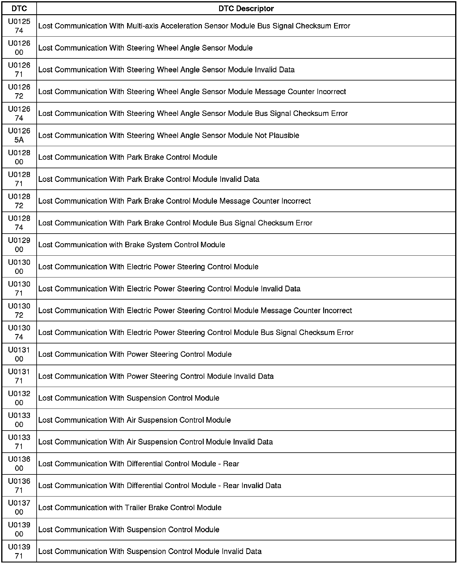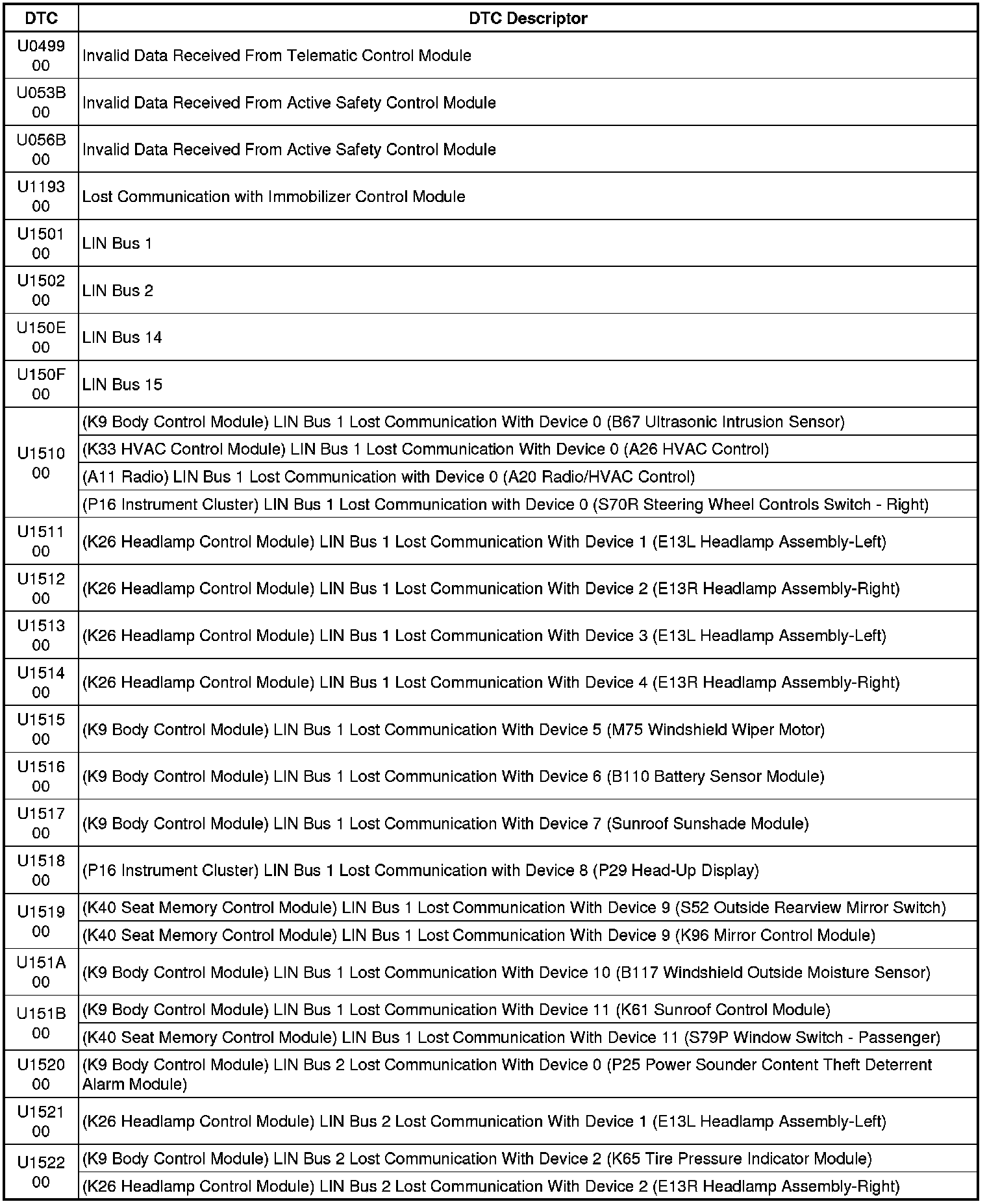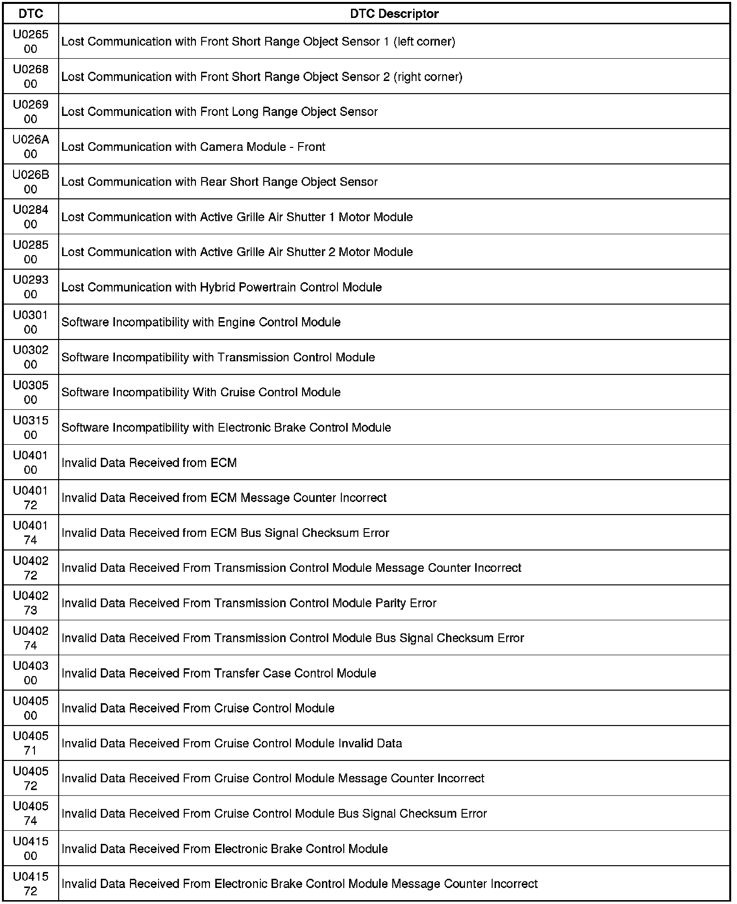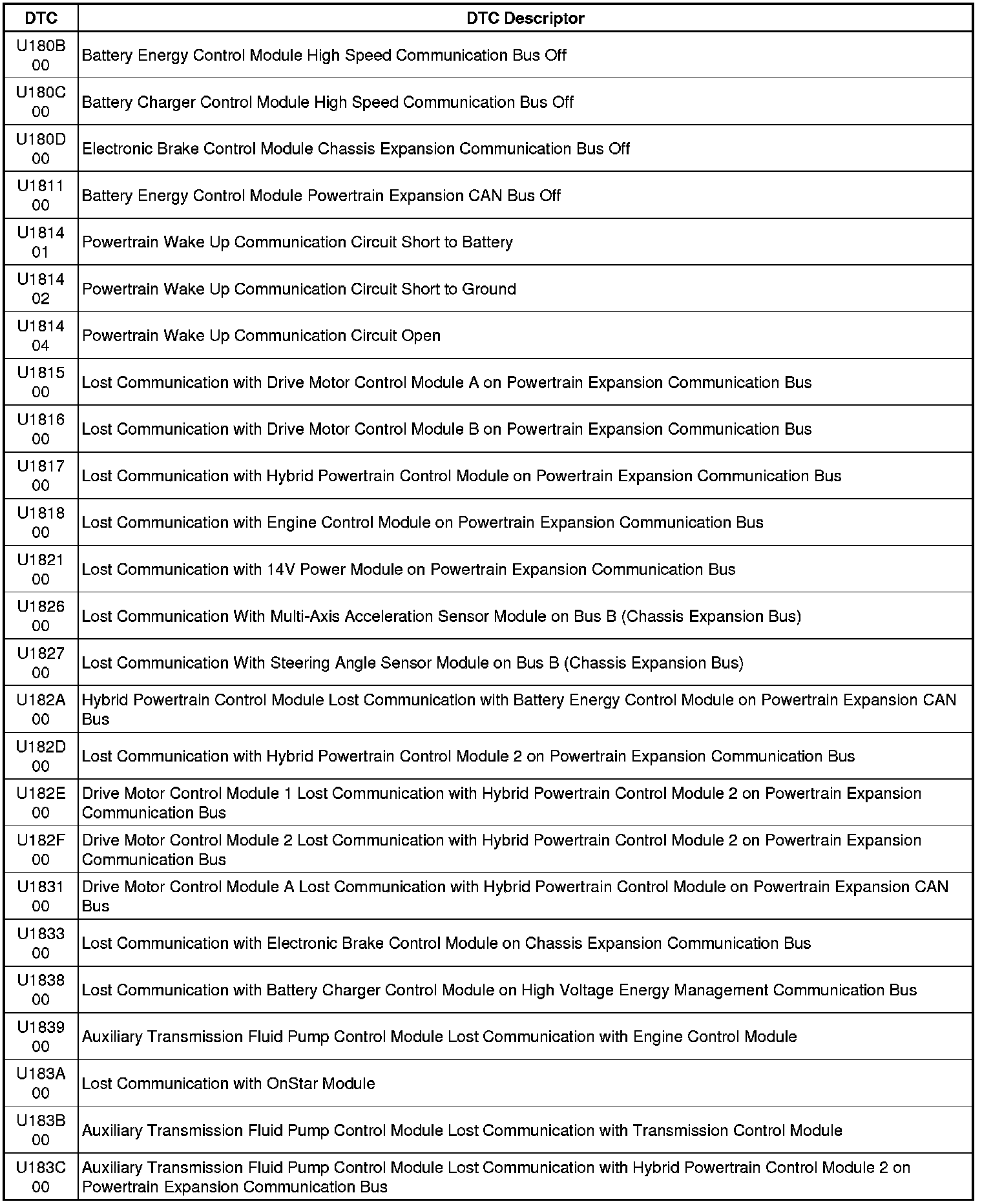 This list includes all Data Communications related U-code DTCs in alphanumeric order with descriptors for all modules. Not all DTCs listed will be applicable to all vehicles.