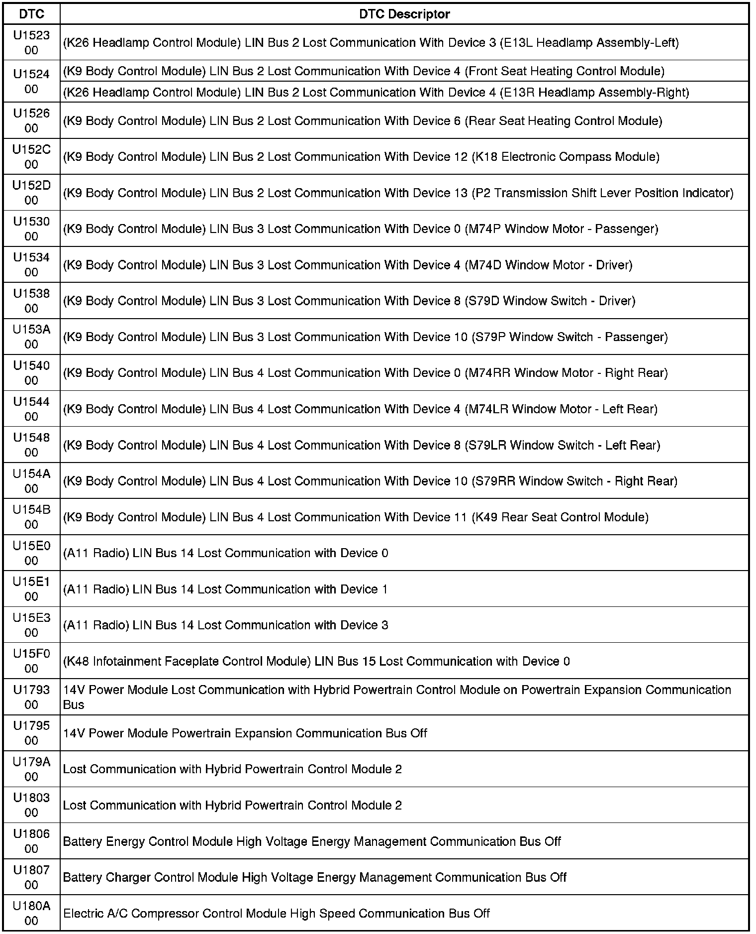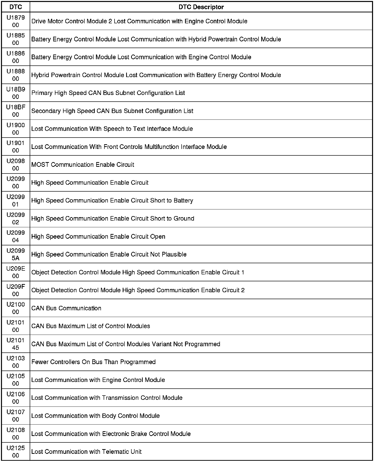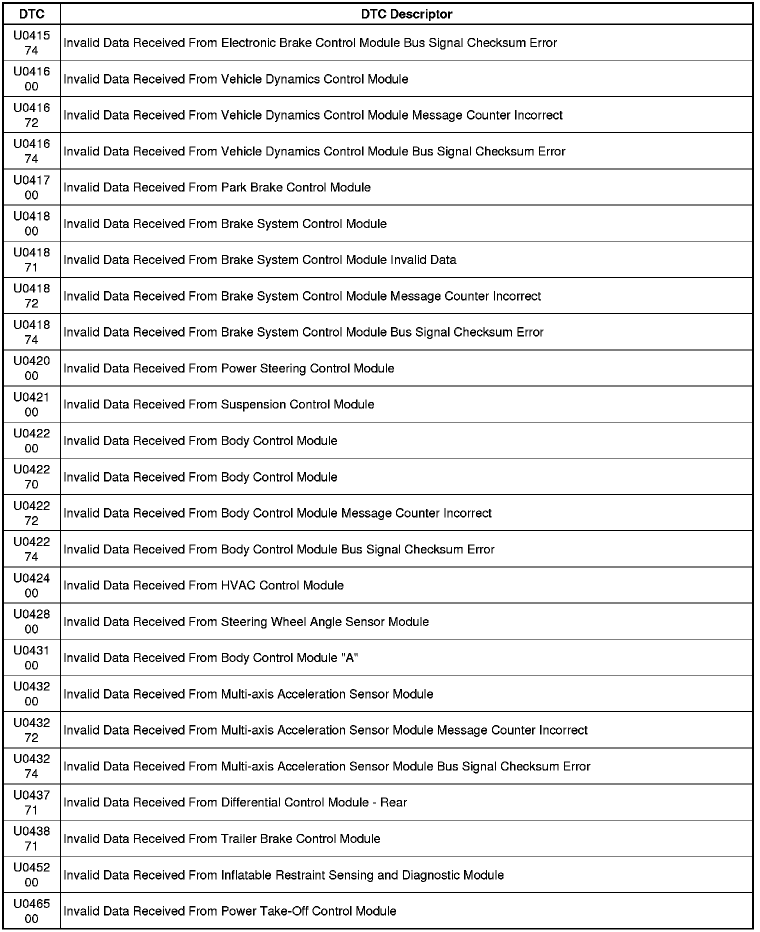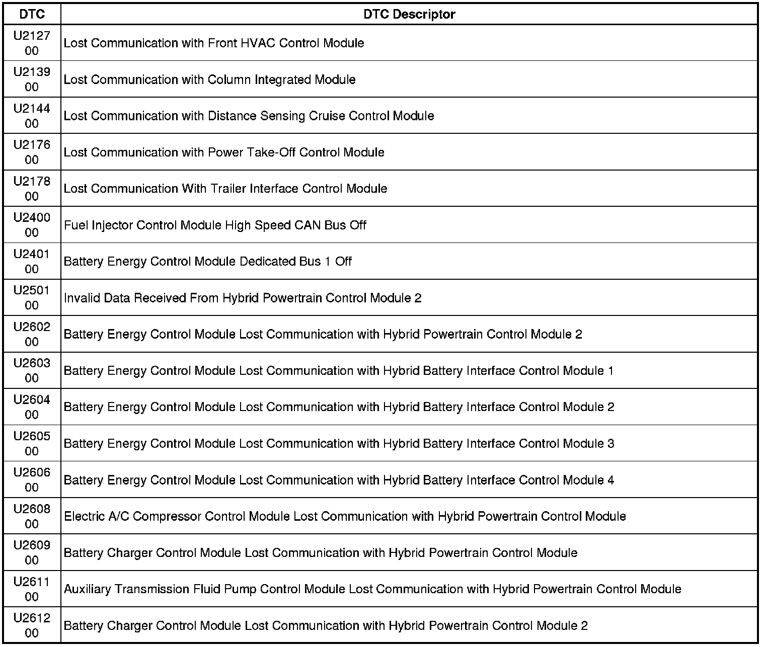 This list includes all Data Communications related U-code DTCs in alphanumeric order with descriptors for all modules. Not all DTCs listed will be applicable to all vehicles.