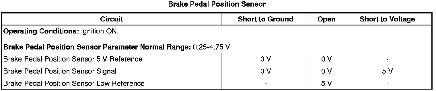 The BPP sensor is a three wire sensor, connected to a 5 V reference circuit, a low reference circuit, and a signal circuit. The ECM supplies 5 V to the BPP sensor, and also provides a sensor ground path on the low reference circuit. The BPP sensor sends a voltage signal to the ECM on the signal circuit. The voltage on the signal circuit will vary from a voltage greater than 0.25 V when the brake pedal is released to a voltage less than 4.75 V when the brake pedal is fully applied.