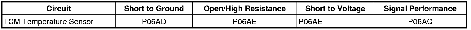 The transmission control module (TCM) power up temperature sensor is located inside of the control solenoid valve assembly which has no serviceable components. The TCM power up temperature sensor provides the temperature of the TCM when the TCM power is on. This temperature reading is used in various shifting and diagnostic routines in the TCM software. This fault is handled inside the TCM and no external circuits are involved.