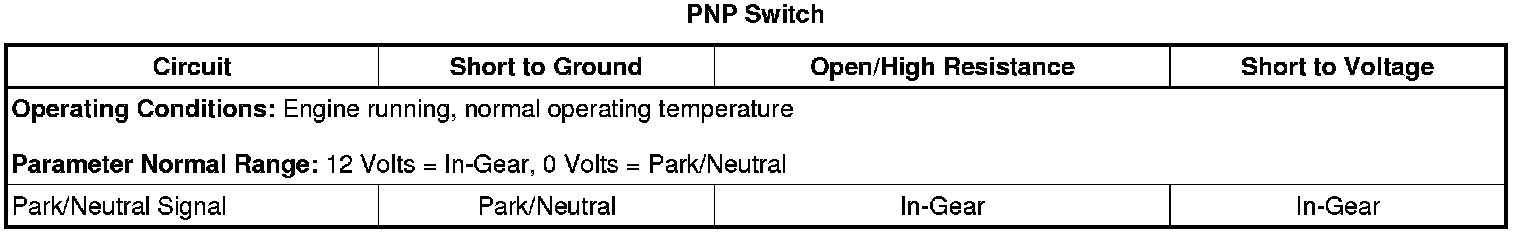 ECM detects the park/neutral switch signal equals 12 volts (in-gear) when the IMS reports a park/neutral range for 0.2 second.