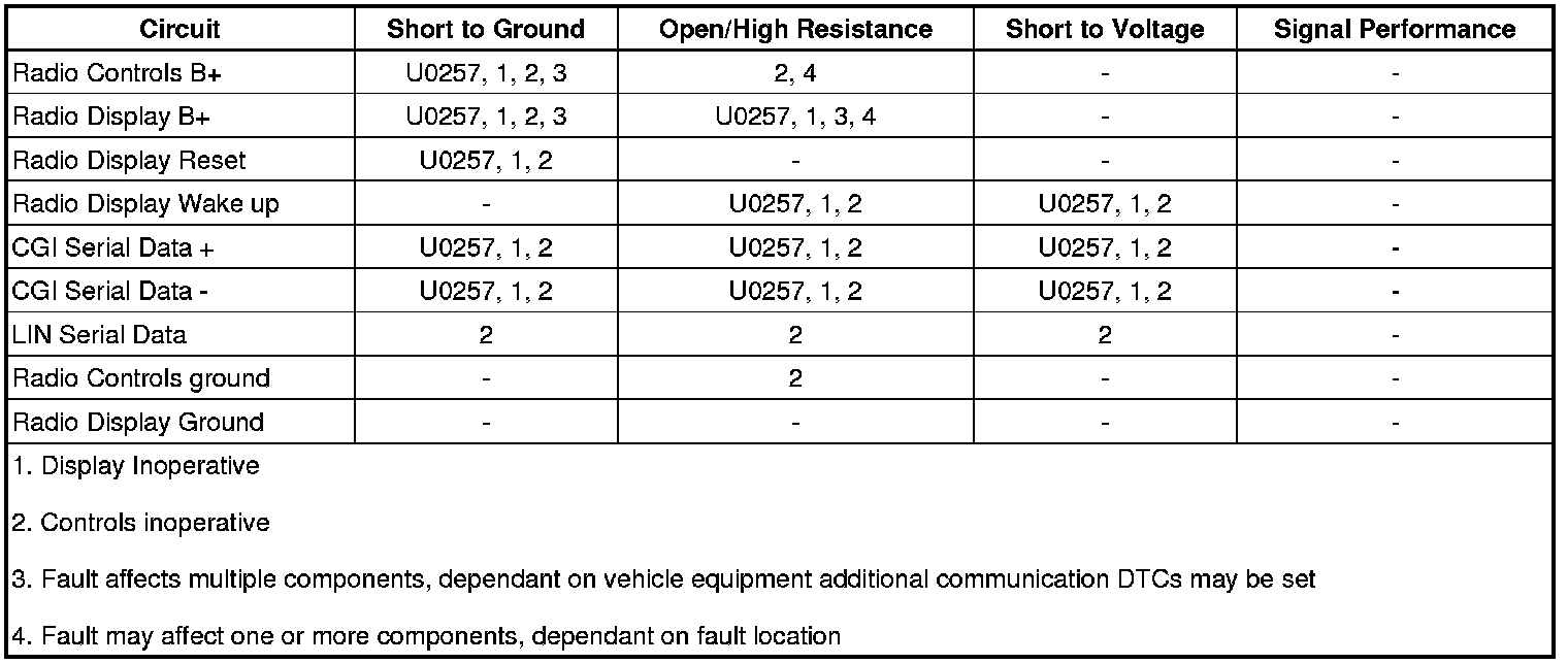 The radio controls and information display are separate components from the radio. Each component is supplied battery voltage and ground. The radio uses the wake up circuit to control the power state of the display. The radio controls communicate with the info display module through the LIN serial data circuit. Display backlighting dimming level, graphical data, and radio control inputs are communicated over the CGI data circuits between the display and the radio.