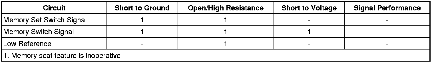 Low reference is supplied to the driver seat memory switch from the seat memory control module. When a memory switch is pressed, the signal circuit from the seat memory control module is pulled low through the switch contacts and series of resistors indicating the memory recall request. In response to this signal, the seat memory control module commands the appropriate seat motors to move to the pre-recorded seat positions stored in memory.