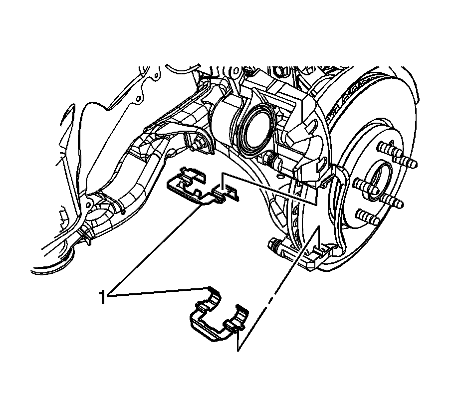 8. Using a backup wrench to hold the brake caliper guide pin stationary, remove the lower brake caliper guide pin bolt (1).