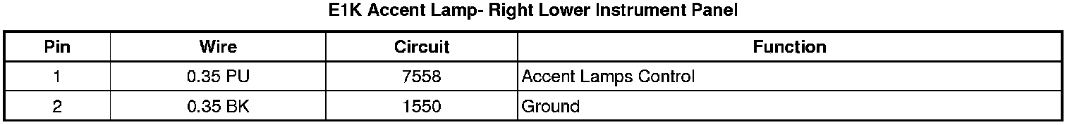 E1K Accent Lamp- Right Lower Instrument Panel