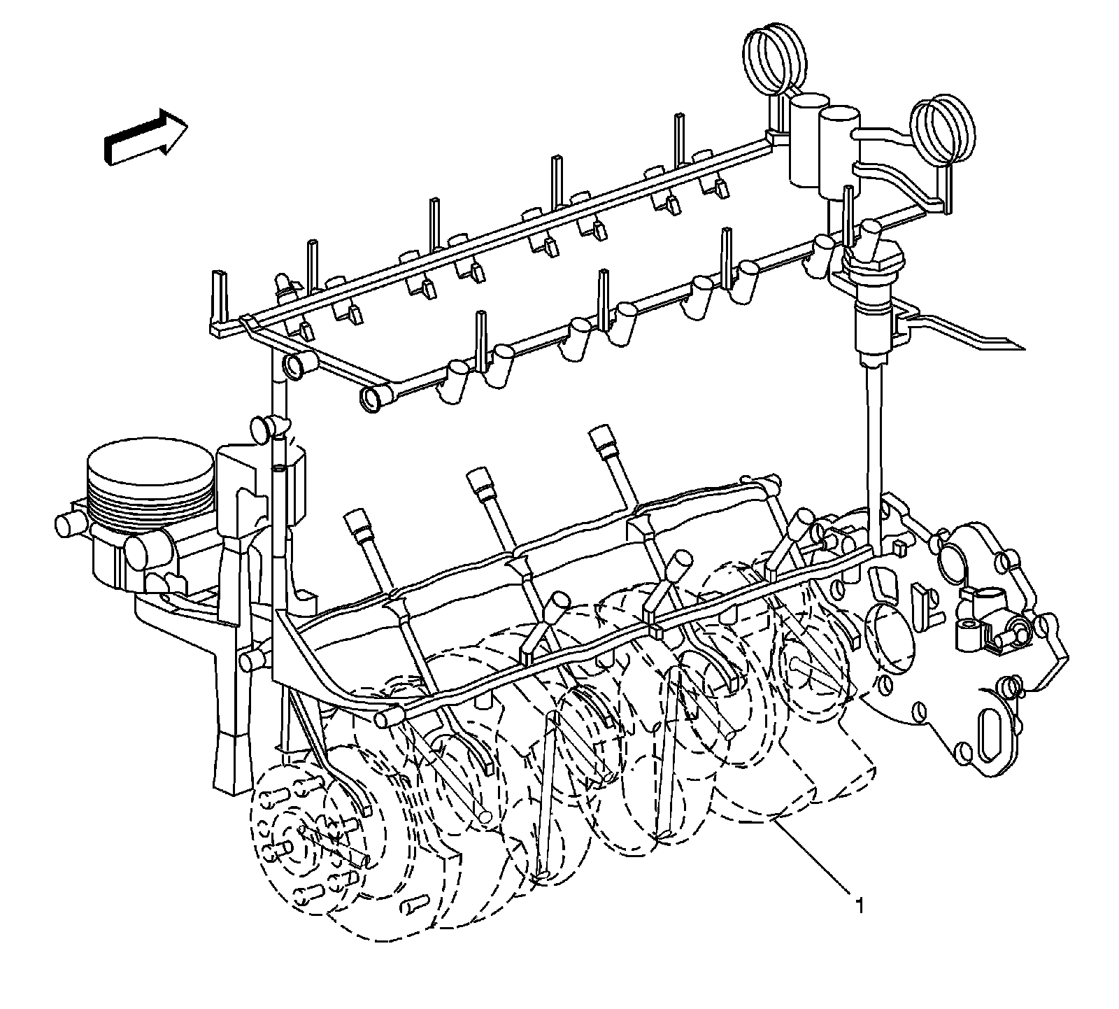 Oil is applied under pressure to the crankshaft (1), connecting rods, balance shaft assembly, camshaft bearing surfaces, valve lash adjusters and timing chain hydraulic tensioner. All other moving parts are lubricated by gravity flow or splash. Oil enters the gerotor type oil pump through a fixed inlet screen. The oil pump is driven by the crankshaft. The oil pump body is within the engine front cover. The pressurized oil from the pump passes through the oil filter. The oil filter is located on the right (front) side of the engine block. The oil filter is housed in a casting that is integrated with the engine block. The oil filter is a disposable cartridge type. A by-pass valve in the filter cap allows continuous oil flow in case the oil filter should become restricted. Oil then enters the gallery where it is distributed to the balance shafts, crankshaft, camshafts and camshaft timing chain oiler nozzle. The connecting rod bearings are oiled by constant oil flow passages through the crankshaft connecting the main journals to the rod journals. A groove around each upper main bearing furnishes oil to the drilled crankshaft passages. The pressurized oil passes through the cylinder head restrictor orifice into the cylinder head and then into each camshaft feed gallery. Cast passages feed each hydraulic element adjuster and drilled passages feed each camshaft bearing surface. An engine oil pressure switch or sensor is installed at the end. Oil returns to the oil pan through passages cast into the cylinder head. The timing chain lubrication drains directly into the oil pan.