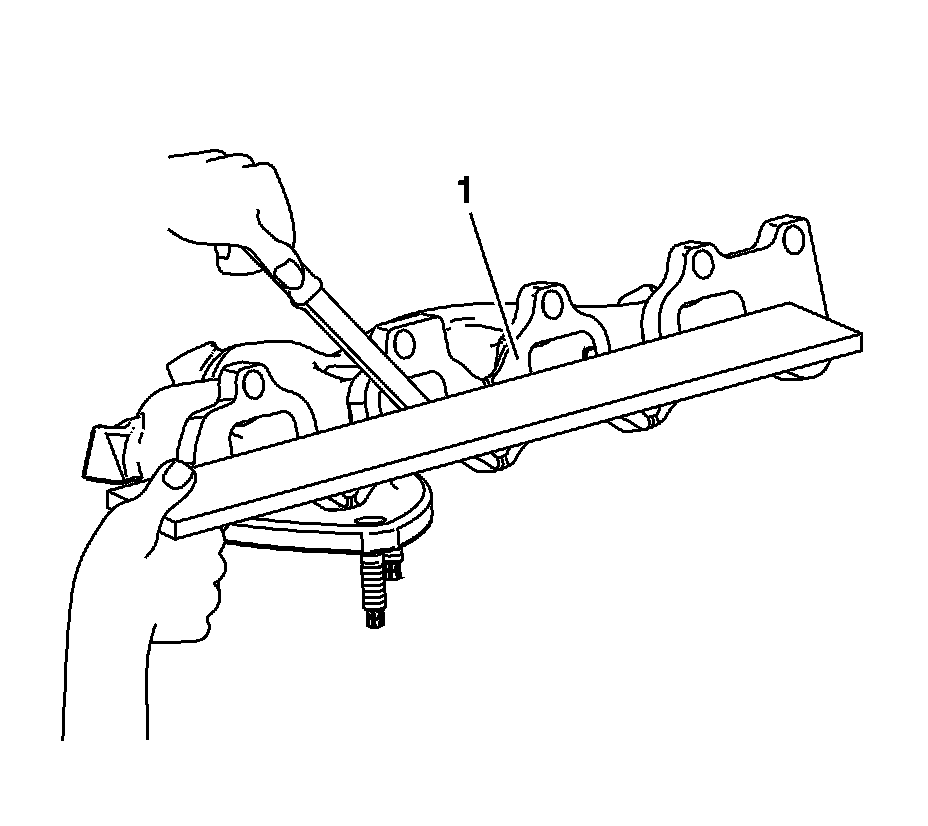 5. Use a straight edge and a feeler gauge and measure the exhaust manifold mounting face (1) for warpage.