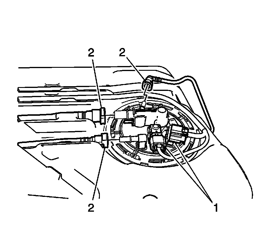 4. Disconnect the fuel and evaporative emission lines (2). Refer to Plastic Collar Quick Connect Fitting Service Service and Repair.