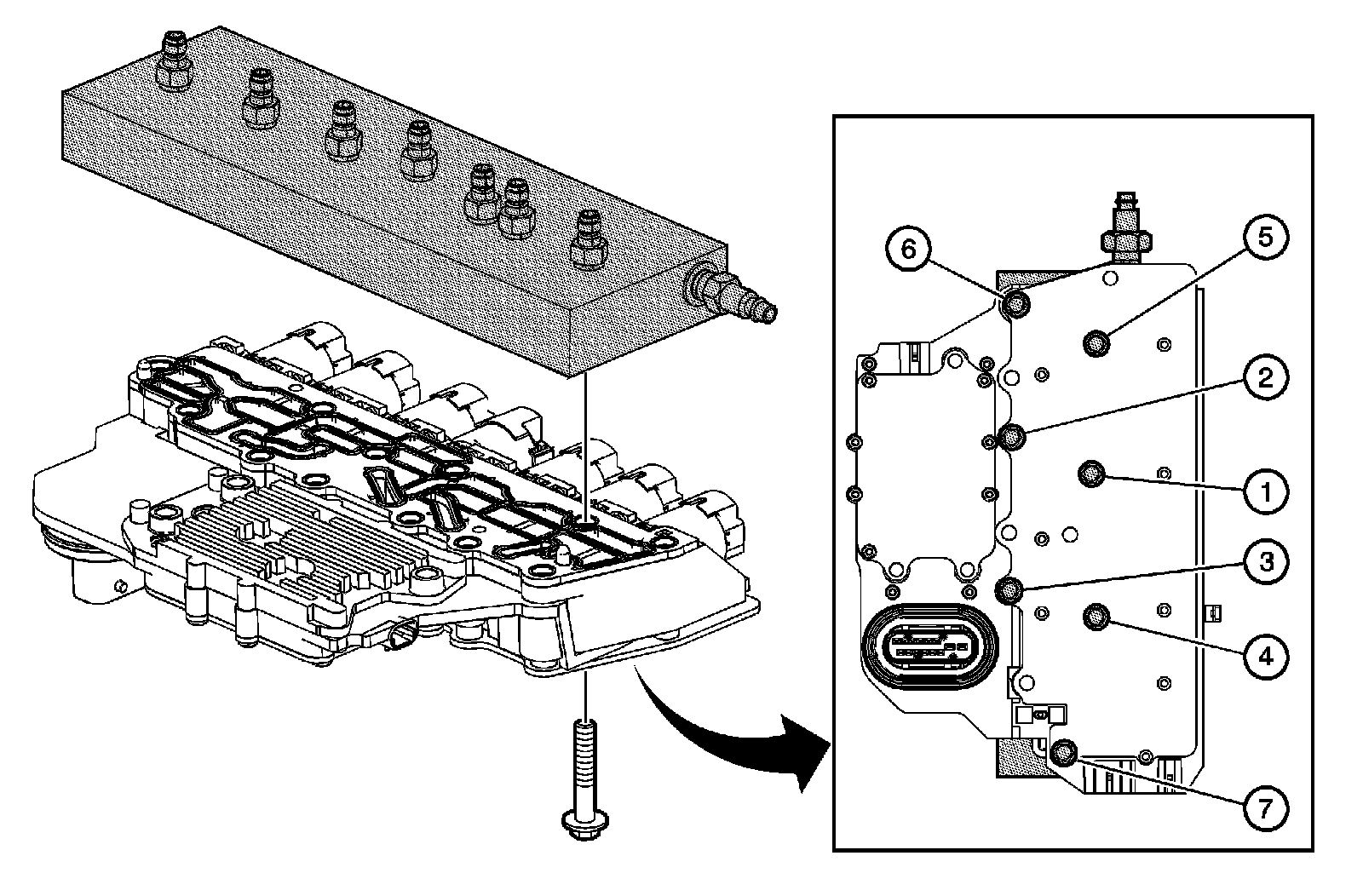 4. Bolt the DT-48616-1 - test plate to the filter plate, and control solenoid valve assembly. Use the bolts and washers supplied with the tool to attach the test block. Tighten the bolts to 5 Nm (44 lb in) using a center out alternating torque sequence.
