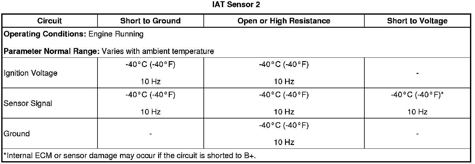 The ECM detects that the IAT sensor 2 signal is greater than 390 Hz, warmer than 150°C (302°F), for greater than 5 s.