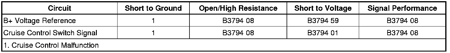 The BCM detects an invalid signal on the cruise control switch signal circuit and sends a serial data message to the ECM. The ECM sets these DTCs when the message is received.