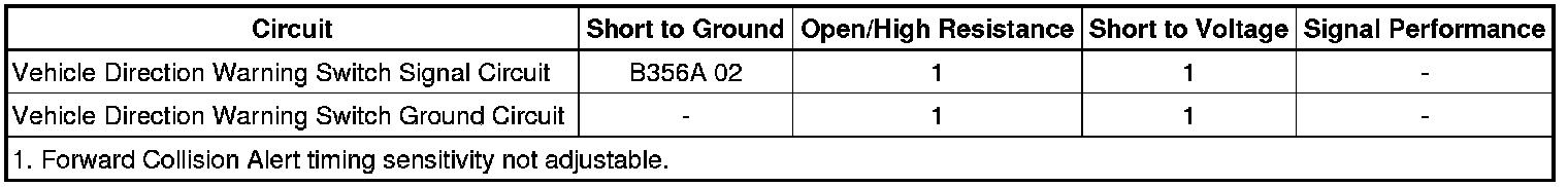 Certain factors will affect the operation of the forward collision alert system. Forward collision alert does not warn the driver of any objects that are not detected as a vehicle, like e.g. pedestrians, animals, signs, guard rails, bridges, construction barrels or other stationary or slow moving objects. In some cases the camera may detect a vehicle that is not in the path ahead, or the system may occasionally provide unrealistic alerts. This could respond to a turning vehicle ahead, guard rails, traffic signs, or other stationary objects. This is normal operation, the vehicle does not need service. When the system is operating properly, the green vehicle ahead alert indicator will illuminate on the vehicle direction display when the system detects a vehicle in the path ahead. This indicates that all of the required operating conditions are met. The green vehicle ahead alert indicator will not appear when the system is having difficulty seeing other vehicles on the road or if the view of the front view camera is blocked with mud, dirt, snow, ice, or slush, if the windshield is damaged, or when weather limits visibility, such as while driving in fog, rain, or snow conditions. This is normal operation, the vehicle does not need service.