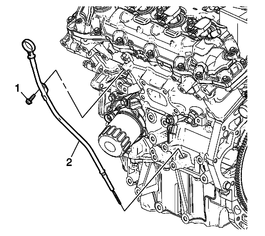 2. Install the oil level indicator and tube (2) by sliding the tube down through the lower crankcase hole.