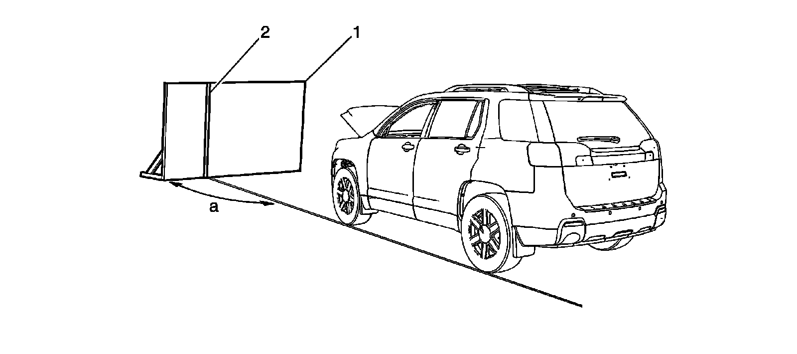 6. The vehicle left tires must be aligned with the reference line (a) extending from the screen with the headlamps aligned with the vertical reference line (2).