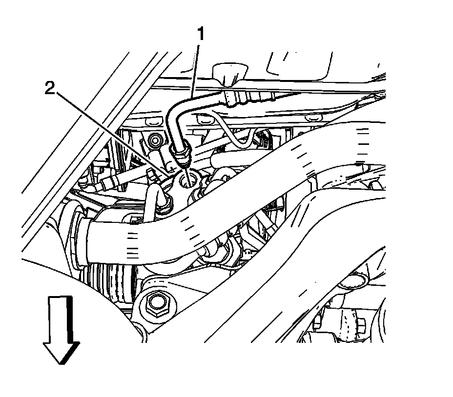 8. Connect the power steering fluid cooling pipe (1) to the power steering gear (2). Tighten the fitting to 34 Nm (25 lb ft).