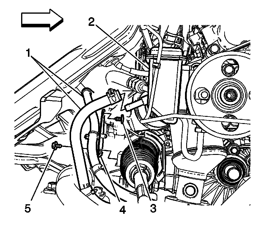 6. Install the power steering fluid cooling pipe bolt (5) to the bracket and tighten to 9 Nm (80 lb in).