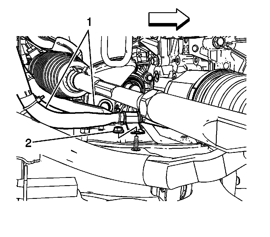 9. Remove the power steering fluid cooling pipe nut (2) and disconnect the bracket from the stud.