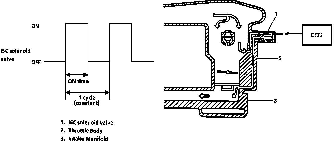 The Idle Speed Control (ISC) valve opens and closes an air bypass passage in the throttle body. The ECM controls the ISC valve according to input signals from various sensors and switches. The ISC automatically compensates for engine load changes and adjusts the idle air flow. If a sudden change in throttle opening takes place (deceleration), bypass air is increased when the throttle valve is opened, and gradually decreases when it closes.