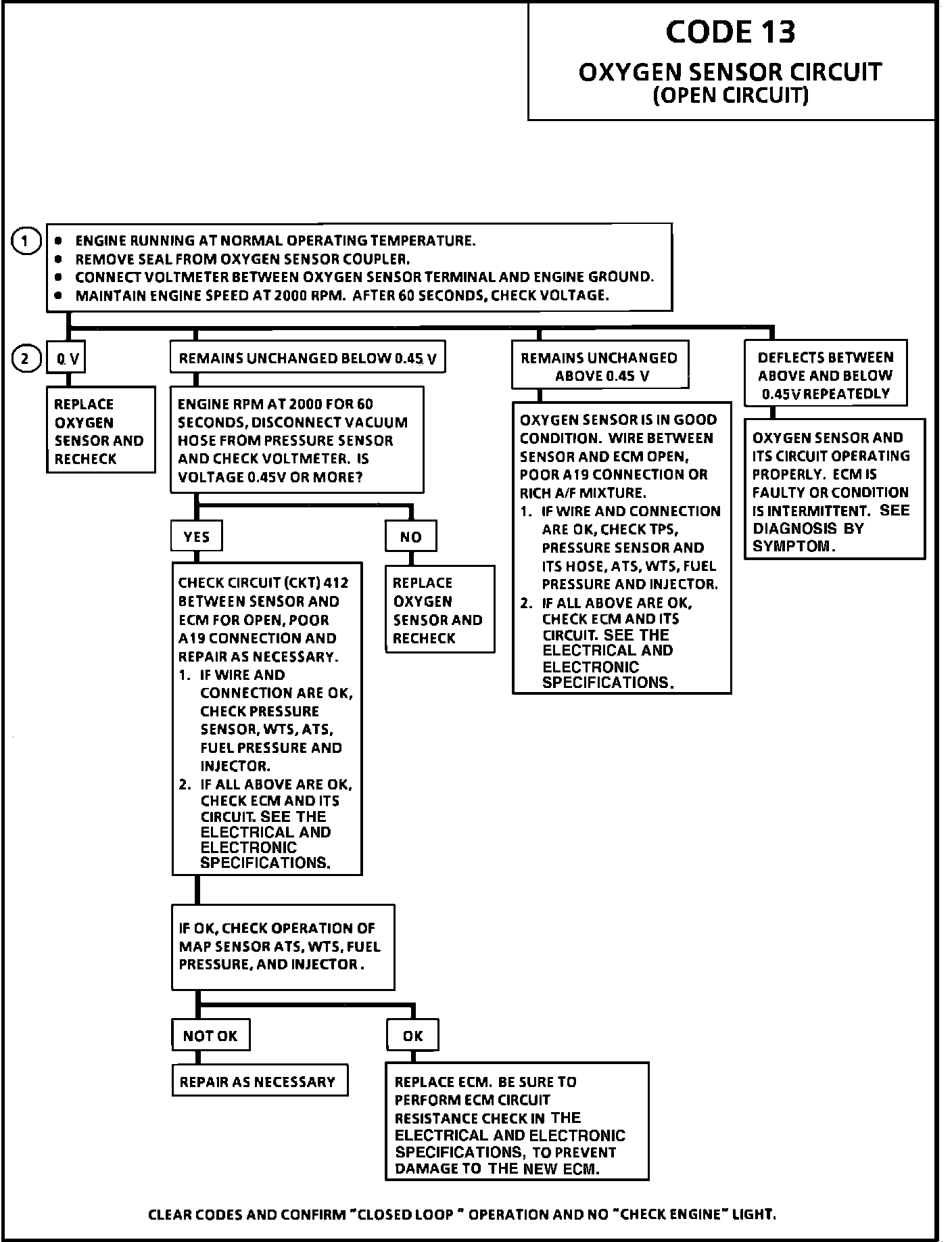 Normal voltage on circuit 412 varies between 100 mV and 999 mV (0.1 and 1.0 volt), while in "CLOSED LOOP." Verify a clean, tight ground connection for circuit 413. Open circuit(s), 412 or 413 will result in a Code 13. If Code 13 is intermittent, see DIAGNOSIS BY SYMPTOM - NO CODES.