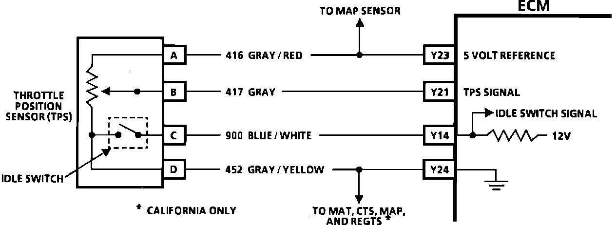The idle switch is used to signal the ECM when the throttle is in the closed or idle position. When properly adjusted, a closed throttle will pull the ECM circuit low (to ground) through the TPS idle switch. The idle switch, if measured separately, will show little or no resistance when closed. When the throttle is opened, the circuit will go high at the ECM and the switch, if measured separately, will show open or infinite resistance.