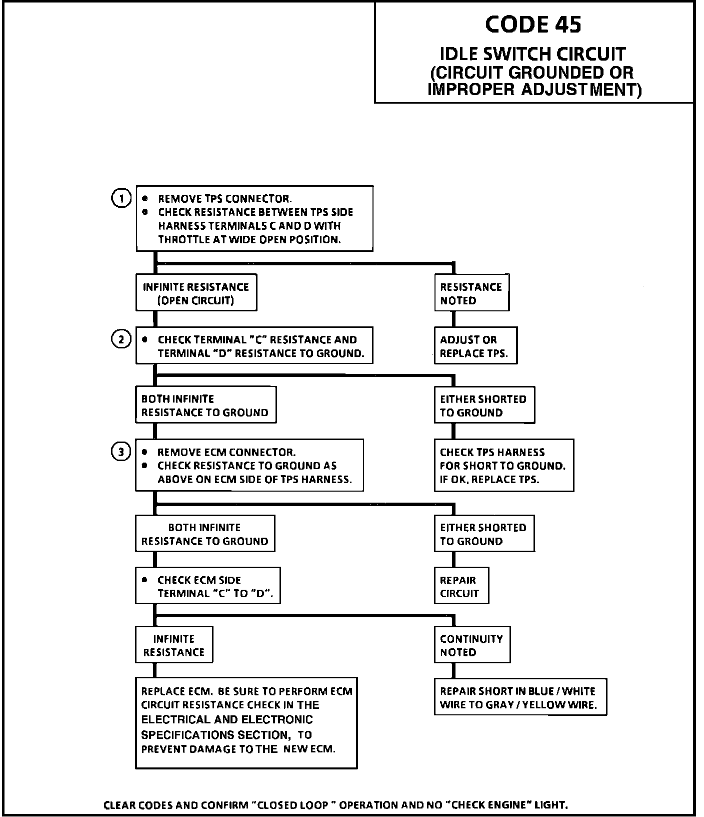 A Code 45 will set if the ECM senses the switch is closed, or circuit ground at off idle conditions.