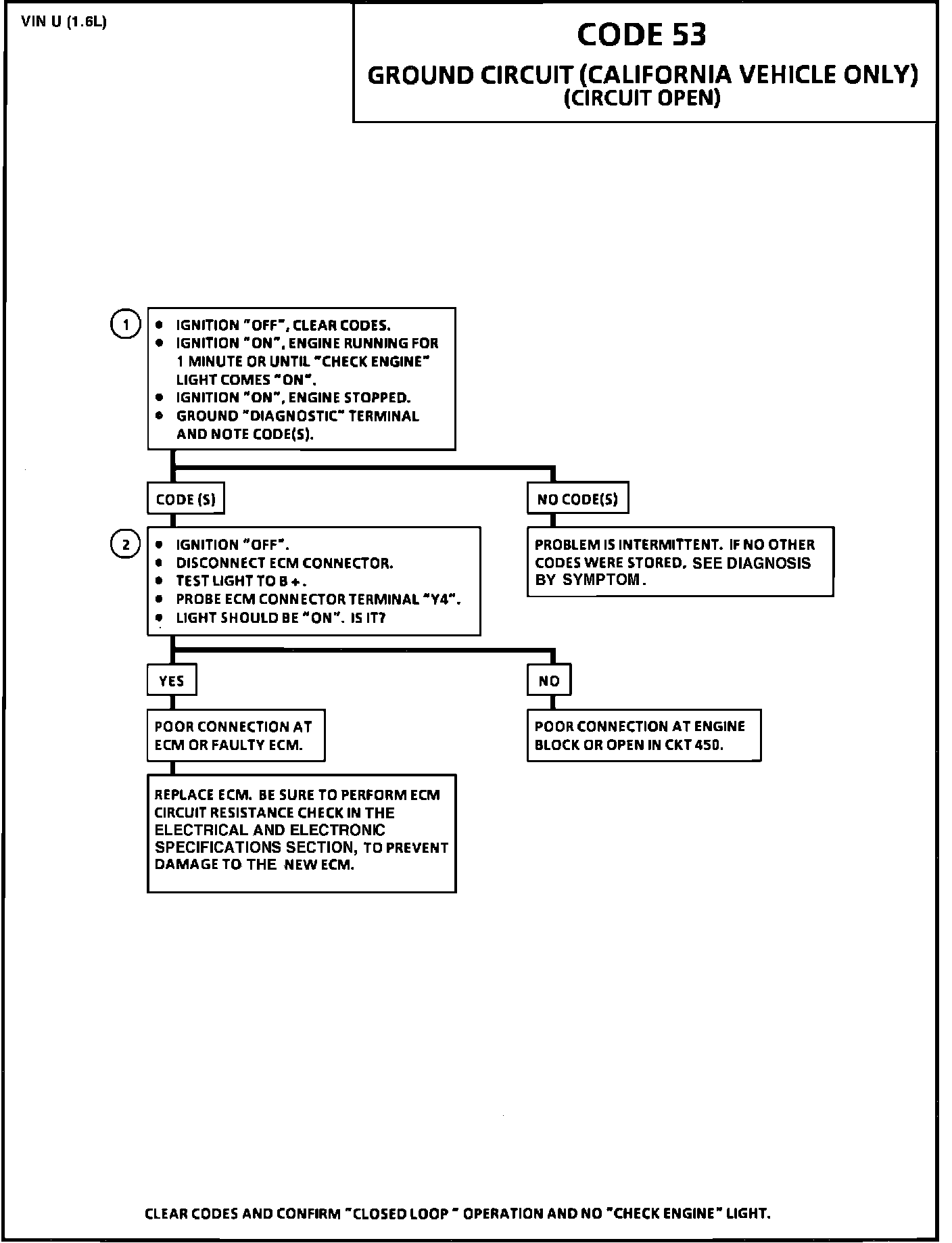 On California vehicles, an additional ground is supplied to the ECM. The ECM supplies 12 volts to circuit 450 through a buffer. The ECM looks for this voltage to be "Low." If voltage is "High," Code 53 will set.