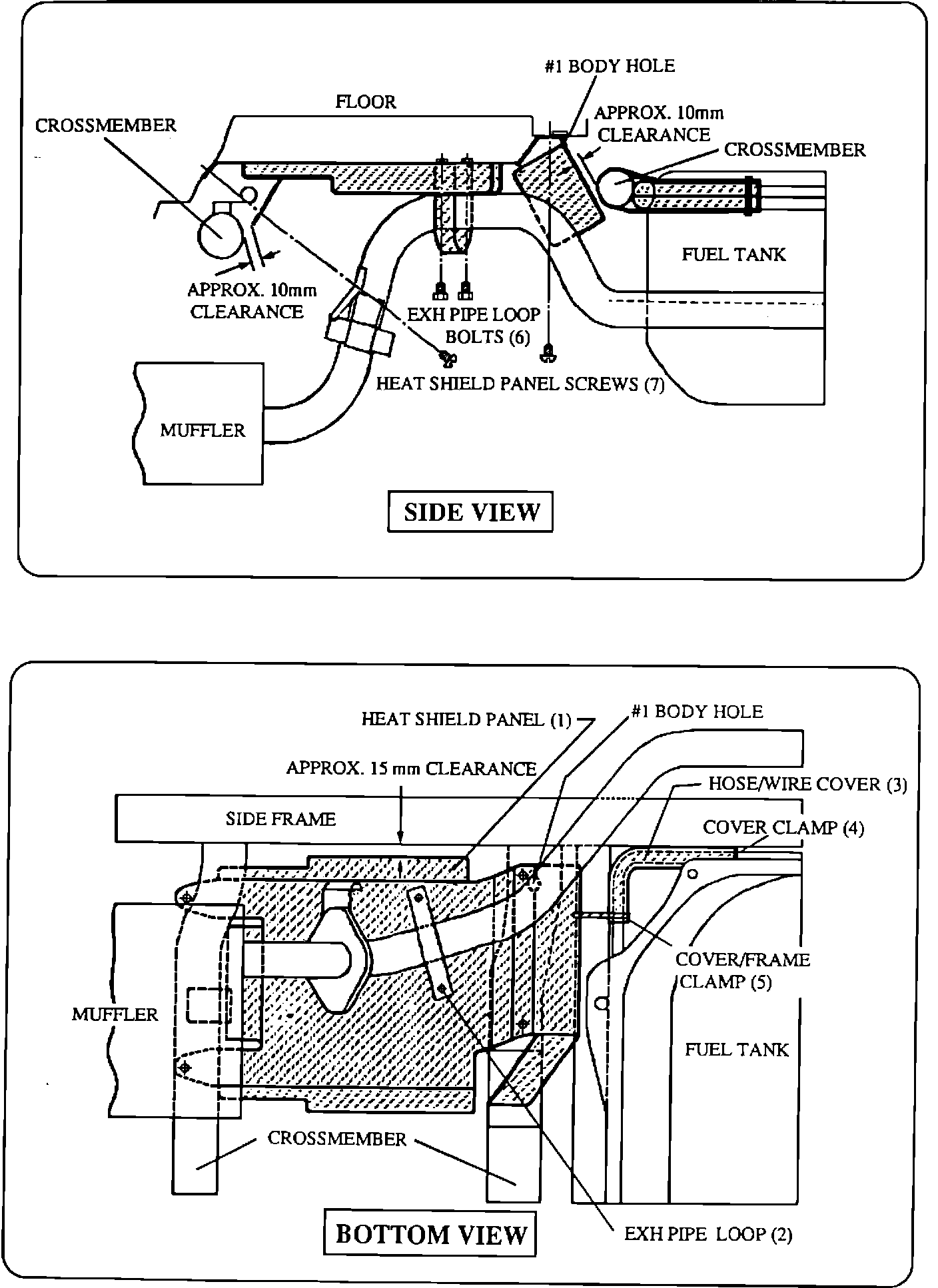 4. Position heat shield panel (1) to floor pan so embossment on heat shield panel is aligned with # 1 body hole. Panel-to-side frame clearance is approximately 15 mm and panel-to-crossmember clearence is approximately 10 mm (see illustrations).