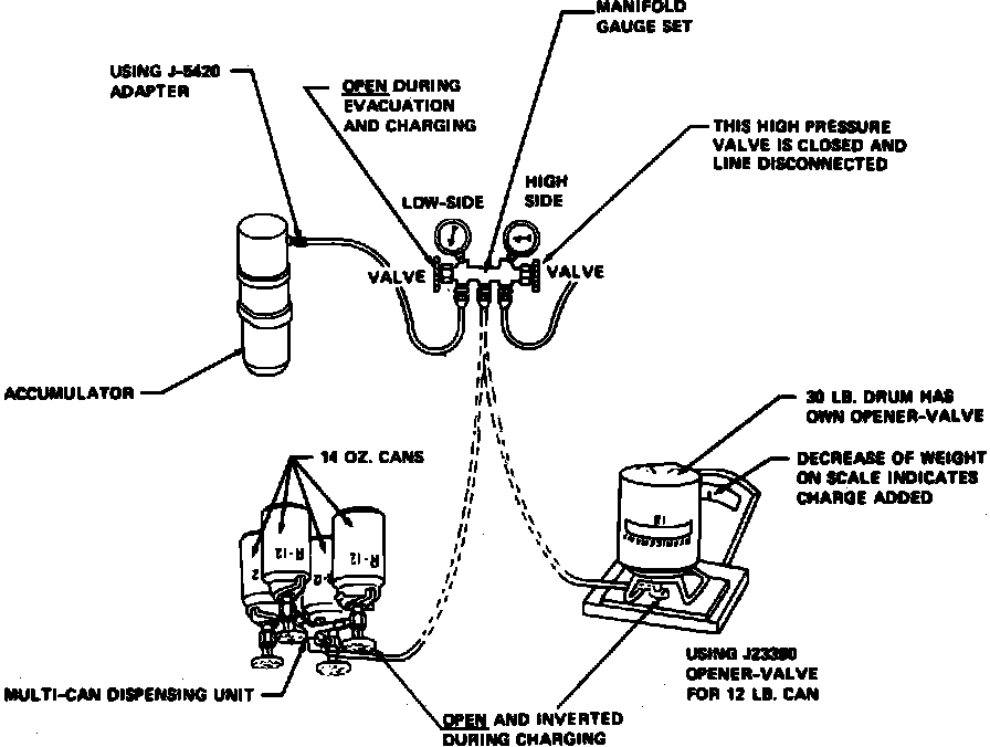 If R-12 drum is used, place on scale and note total weight before charging. During charging, watch scale to determine amount of R-12 used. If 14 ounce R-12 cans are used, close tapping valve, then attach cans following instructions included with manifold adapter.