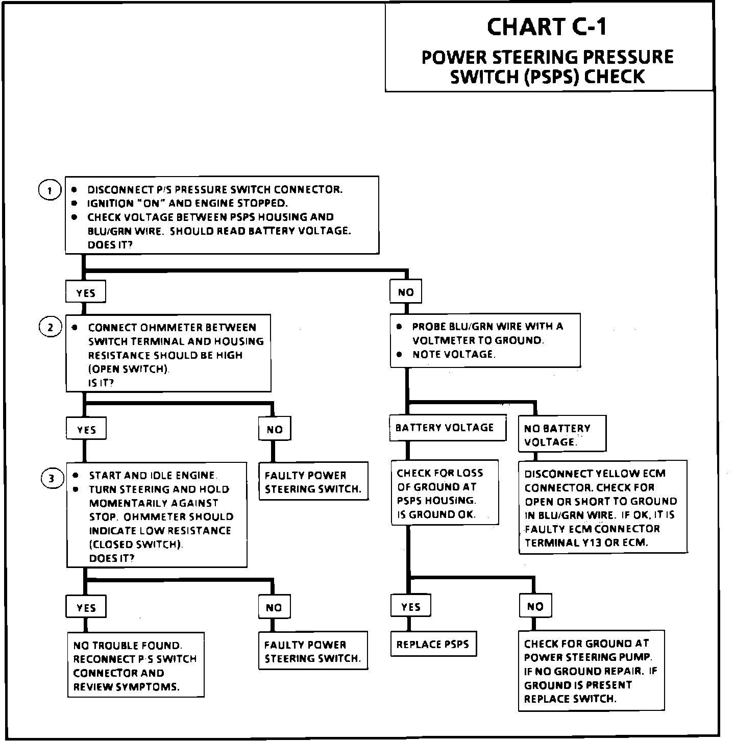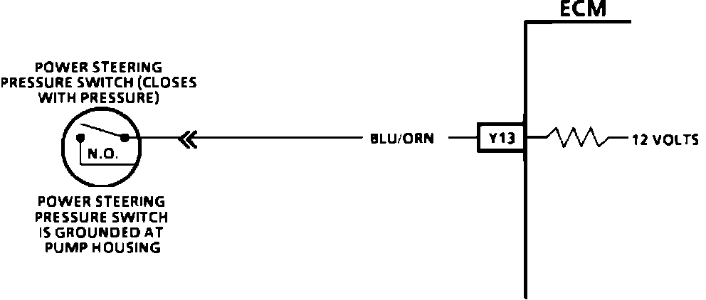 The Power Steering Pressure Switch (PSPS) is normally open to ground, and ECM terminal "Y13" will be near the battery voltage. Turning the steering wheel increases power steering oil pressure and its load on an idling engine. The pressure switch will close before the load can cause an idle problem. Closing the switch causes ECM terminal "Y13" to read less than 1 volt. The ECM will increase the idle air rate and prevent engine load stall.