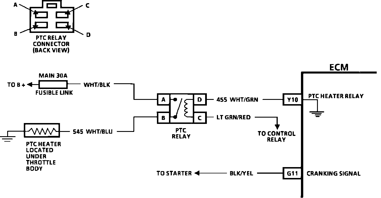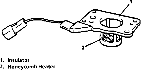 Located between the throttle body and the intake manifold, the Positive Temperature Coefficient (PTC) heater is a heater grid which is controlled by the ECM through the PTC heater relay. When the engine coolant temperature is below 30°C (86°F), the heater is energized for up to ten seconds.