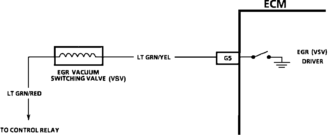 The EGR Vacuum Switching Valve (VSV) solenoid is controlled by the ECM. The VSV solenoid is supplied with battery voltage. The ECM will switch to ground to turn the solenoid "ON" for EGR operation.