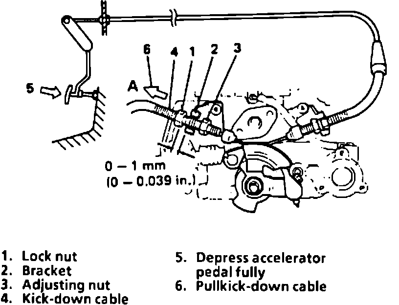 2. Loosen the kick-down cable lock nut and adjusting nut considerably. (See illustration).