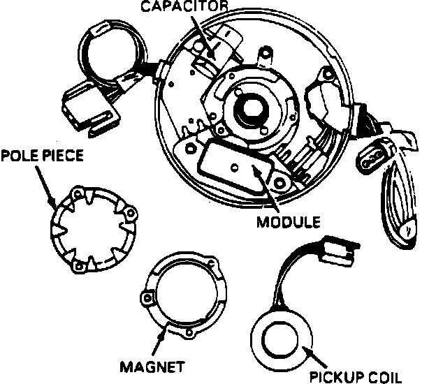 The magnetic pick-up assembly located inside the distributor consists of a permanent magnet, a pole piece with internal teeth, and a pick-up coil. When the teeth of the timer core, rotating inside the pole piece, line up with the teeth of the pole piece, an induced voltage in the pick-up coil signals the electronic module to trigger the coil primary circuit. The primary current decreases and a high voltage is induced in the ignition coil secondary winding which is directed through the rotor and secondary leads to fire the spark plugs. The capacitor in the distributor is for radio noise suppression.