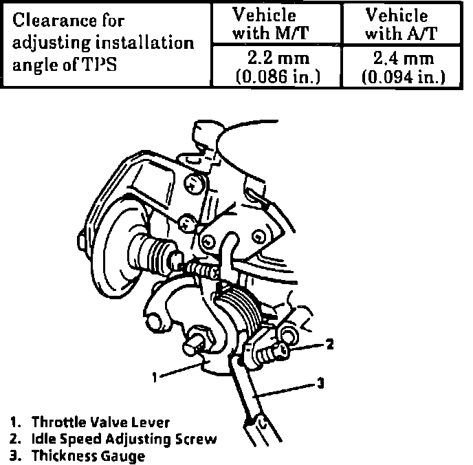 4. Insert one of the following feeler gauges between the throttle lever and the idle adjusting screw.