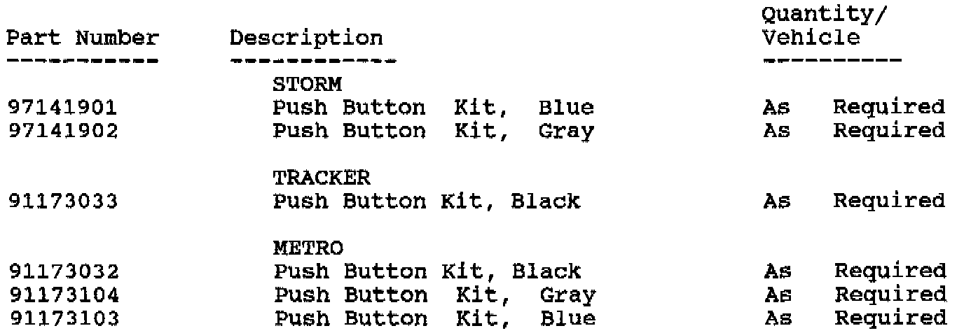 A pre-shipment of push button repair kits (part number 91173033, 91173104, 91173032, 91173103, 97141901, 97141902), will be sent to involved dealers the week of May 6, 1996. Pre-shipment parts will be charged to the dealers' open parts account. Please refer to your "Involved Vehicle Listing" prior to ordering additional requirements.