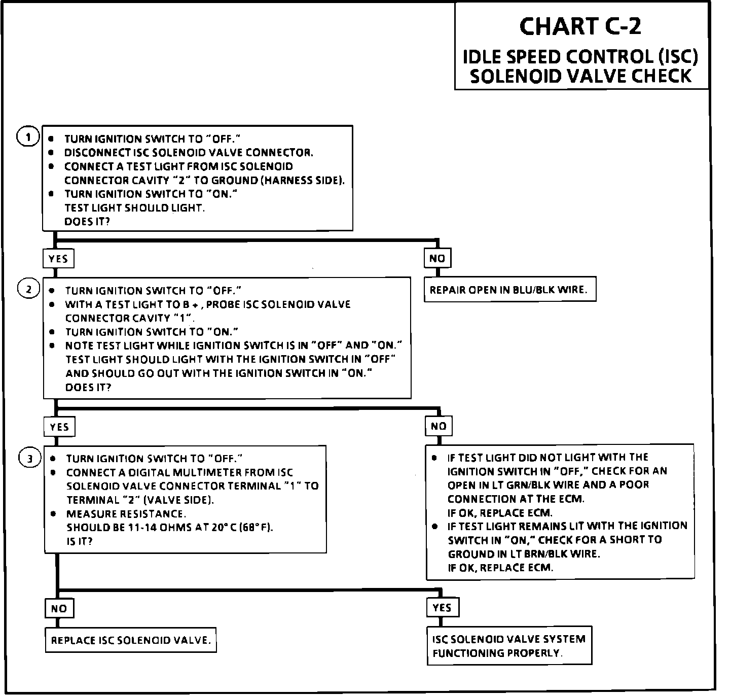 3. This checks the resistance of the ISC solenoid. Should be 11-14 ohms at 20°C (68°F).