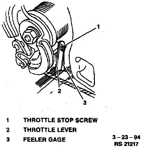 E. Insert 0.5 mm (0.020 inch) feeler gage between throttle stop screw and throttle lever. DVOM should indicated continuity. If steps C, D or E are unsatisfactory, return to step A and repeat entire procedure.