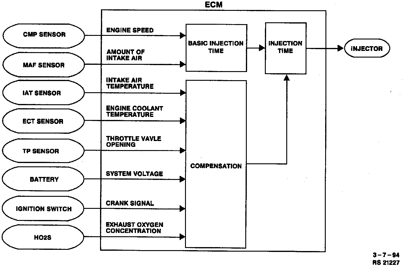 The main control sensor is the Heated Oxygen Sensor (HO2S), which is located in the exhaust manifold. The HO2S provides the ECM with exhaust stream oxygen content information. The ECM modifies the air/fuel mixture by changing the injector pulse width signal sent to the injectors. By constantly measuring the exhaust oxygen content and adjusting the injector pulse width, the air fuel ratio is kept very close to the optimal 14.7:1. This is the range at which the three-way catalytic converter operates most effectively and at which the vehicle's emissions are kept to a minimum. The constant tailoring of the air/fuel ratio based upon the HO2S feedback is referred to as "Closed Loop" operation.