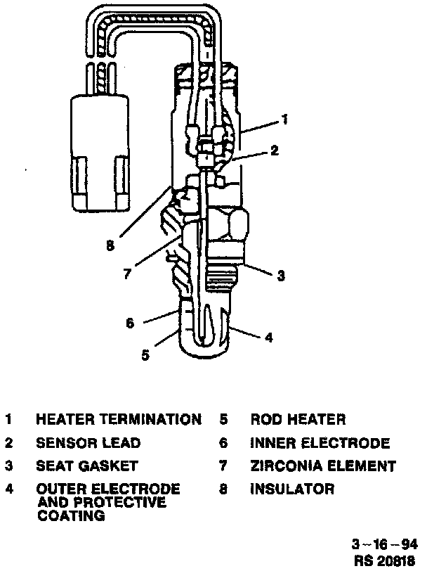 The Heated Oxygen Sensor (HO2S) is located in the exhaust manifold and detects the concentration of oxygen in the exhaust gases. It consists of the zirconia element (with thin platinum surface coating) which generates voltage, a lead wire which draws out the voltage, and cover and housing which protects the zirconia element from damage. The HO2S also incorporates a heater element. Refer to Chart C-1A Oxygen Sensor Heater Check to verify that HO2S heater is working properly.