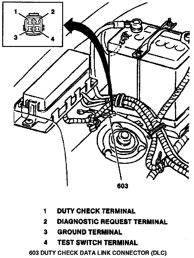 The Duty Check DLC is located in the right rear engine compartment near the battery. Diagnostic Trouble Codes (DTCs) stored in ECM memory can be read by counting the flashes of the Malfunction Indicator Lamp (MIL) after grounding the diagnostic request terminal in the Duty Check DLC as shown in the accompanying image. When this terminal is grounded, the ECM enters its diagnostic mode and outputs DTCs to the MIL.