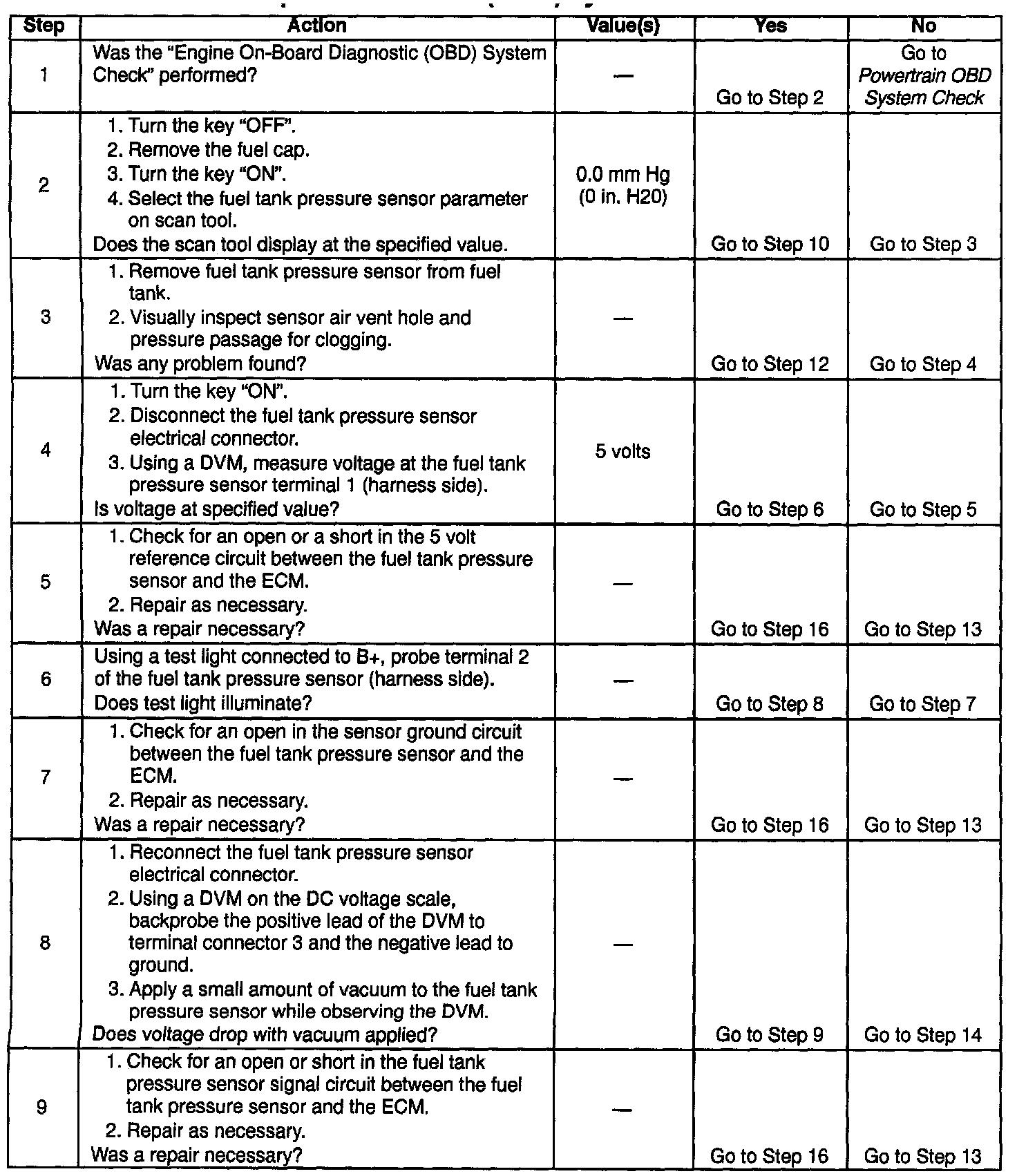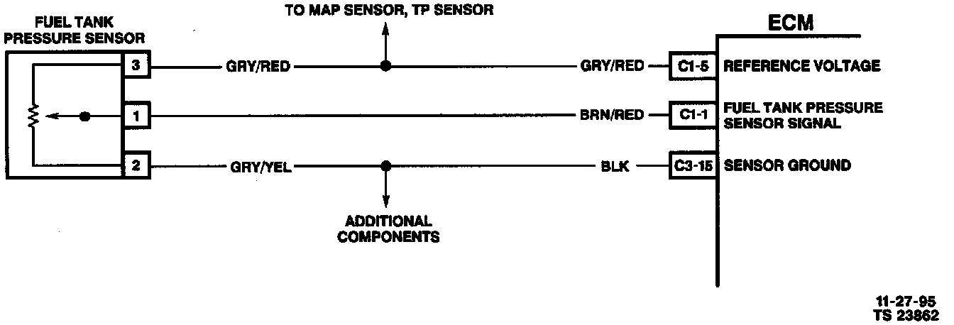 The fuel tank pressure sensor response to changes in fuel tank pressure or vacuum. The fuel tank pressure sensor signal voltage to the ECM varies from a minimum of about 0.2 volts with pressure in the fuel tank to above 4 volts with a high vacuum situation in the fuel tank (vent solenoid stuck closed).
