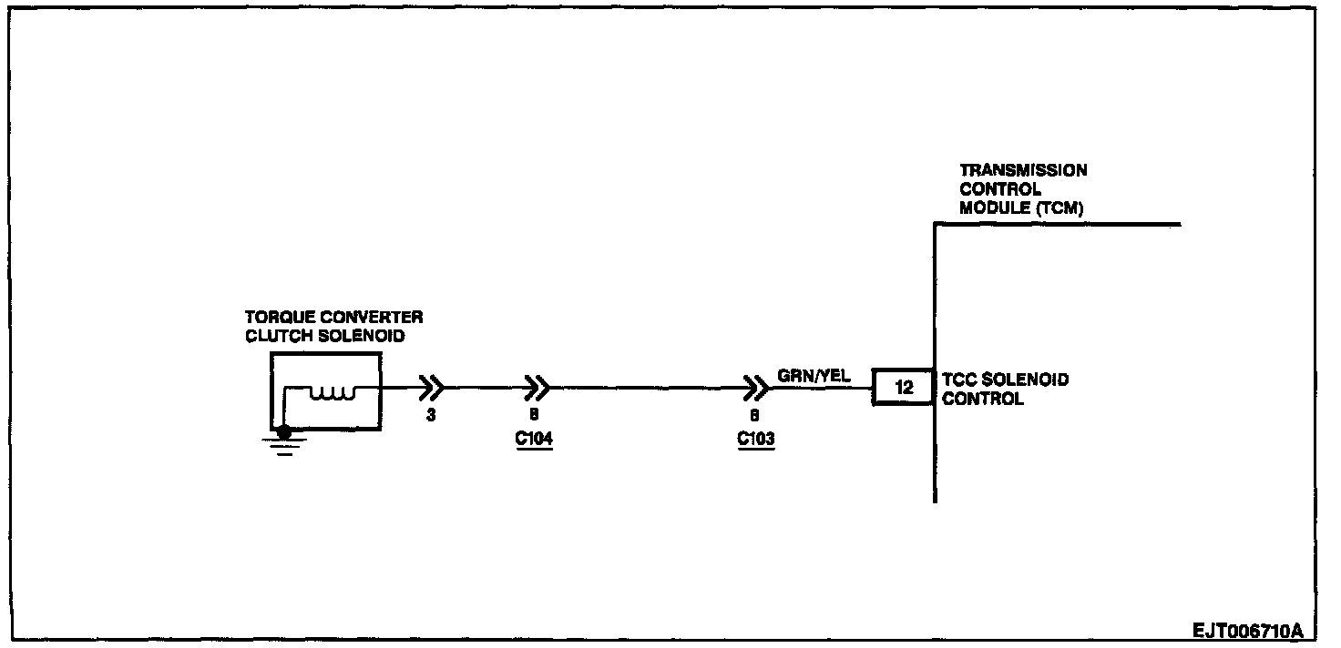 The Torque Converter Clutch (TCC) Solenoid is used to engage the lock-up clutch. The Transmission Control Module (TCM) outputs system voltage to turn ON (energize) or remove voltage to turn OFF (de-energize) to control the hydraulic pressure to the lock-up valve within the transmission. The TCC solenoid is always OFF in 1st and 2nd gears. The TCC is ON in 3rd and 4th gears when the TCM deems it appropriate. The TCC solenoid is NEVER on during 4L operation or when the engine coolant temperature is below 30°C (8O°F).