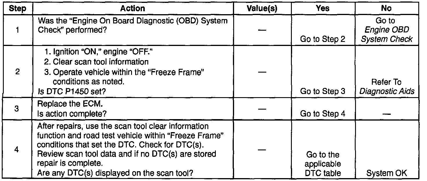 If DTC P1450 cannot be duplicated, the information included in the Freeze Frame data can be useful in determining vehicle operating conditions when the DTC was last set. This may assist in determining how often the DTC sets.